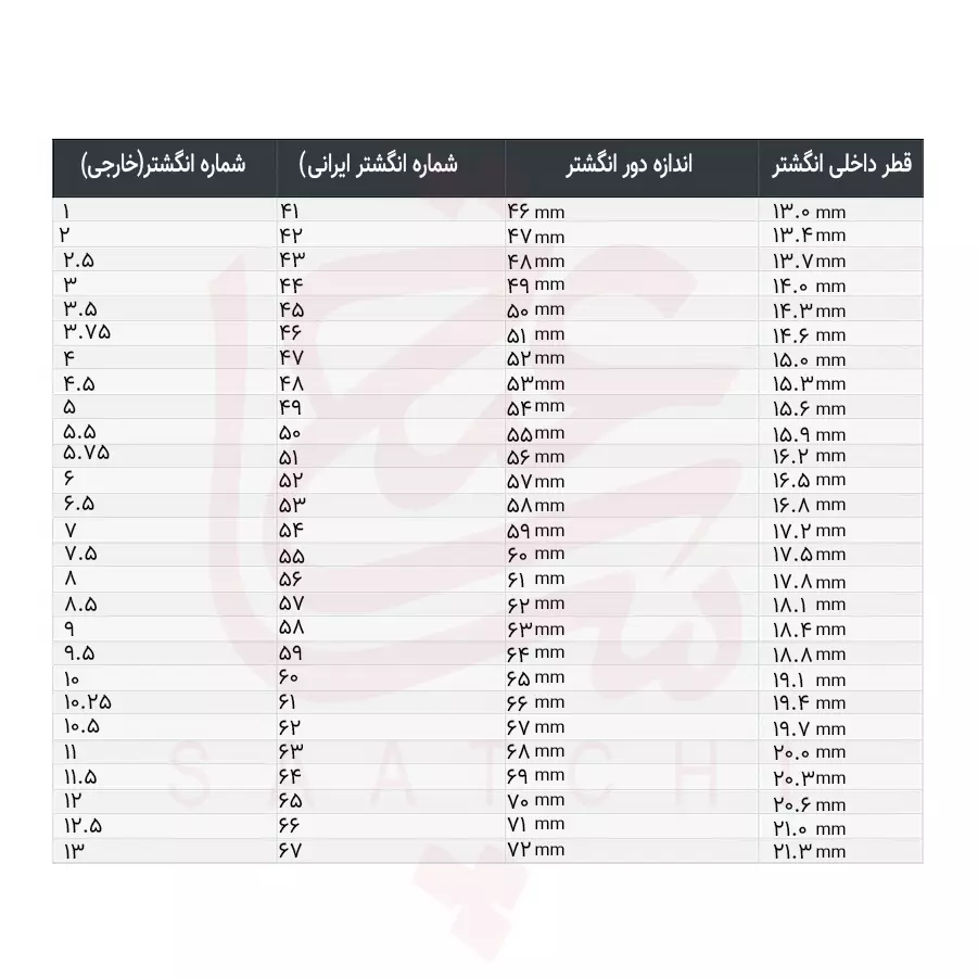انگشتری که برایتان مناسب است را در نظر بگیرید و قطر داخلی آن را با کولیس یا خط کش اندازه بگیرید و سپس با کمک جدول زیر سایز انگشتر خود را مشخص کنید.